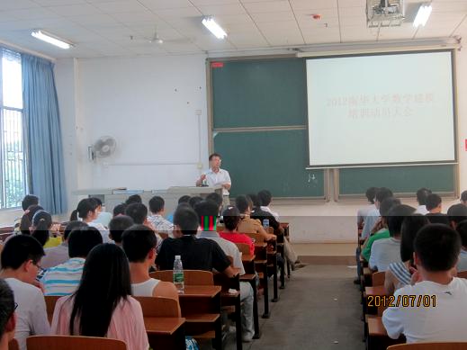 2012年7月1日上午,我校2012年全國大學生數學建模競賽暑假培訓動員會在1教114教室隆重舉行。為期34天的培訓工作就此拉開了序幕。2003网站太阳集团院長歐陽自根教授、院黨委書記彭建軍教授、副院長胡和平副教授,教務處副處長廖基定教授、數學教研室主任廖新元教授和教師代表以及去年參賽和今年校選拔賽獲獎的同學(40個隊)參加了此次動員會。