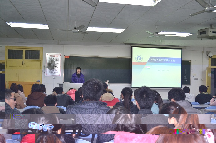 接着陳老師就十八大報告中提出的要建設好幹部隊伍,圍繞如何做好一名學生幹部這一問題,從學生幹部的素質和意識兩方面展開論述。一名優秀的學生幹部應具有優秀的思想政治素質、較強的能力素質、高尚的道德素質、過硬的文化素質、健康的心理素質等。學生幹部還應重點培養責任意識、團隊意識、人本意識、創新意識,培養自己的學習與實踐能力,有效組織協調各項工作,以身作則地帶領同學共同進步。在培訓中陳老師還重點強調了學生幹部在了解和服務同學的時候,要重點關注學生的心理健康問題,對哪些情況應重點關注作了詳細介紹,要積極發揮同齡人的優勢,做好朋輩輔導,争取做到助己自助、助人自助。